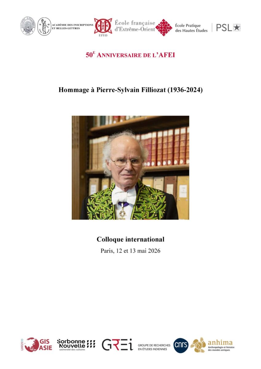 Charlotte Schmid organise avec Silvia d’Intino (CNRS-EHESS) et Sylvain Brocquet (université d’Aix-Marseille), dans le cadre du 50e anniversaire de l’Association française des études indiennes, un colloque en hommage à Pierre-Sylvain Filliozat auxquels sont associés l’EPHE-PSL, l’Académie des Inscriptions et Belles Lettres, la Société Asiatique, La Sorbonne nouvelle, le Groupement de recherches en Etudes Indiennes (GREI) et le CNRS-anhima.