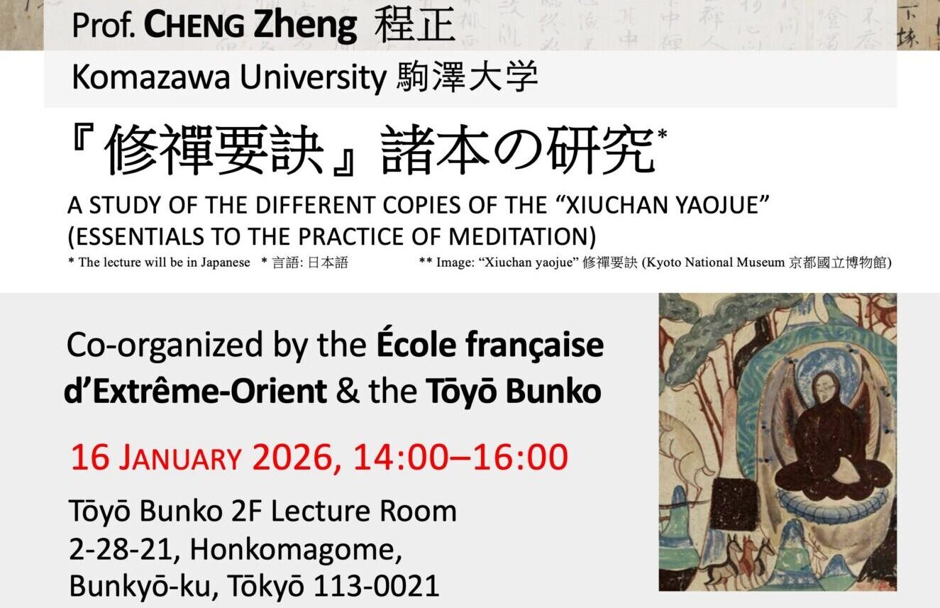 Costantino Moretti organise, en collaboration avec le Tōyō Bunko, une conférence par le Professeur Cheng Zheng 程正 (Komazawa University) intitulée « 『修禪要訣』諸本の研究 » [A Study of the Different Copies of the « Xiuchan Yaojue » (Essentials to the Practice of Meditation)].