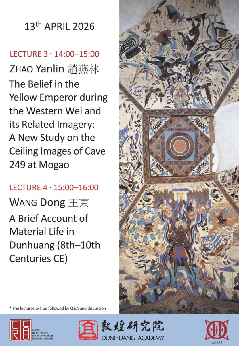 – à 14h00, Zhao Yanlin présente « The Belief in the Yellow Emperor during the Western Wei and its Related Imagery: A New Study on the Ceiling Images of Cave 249 at Mogao »