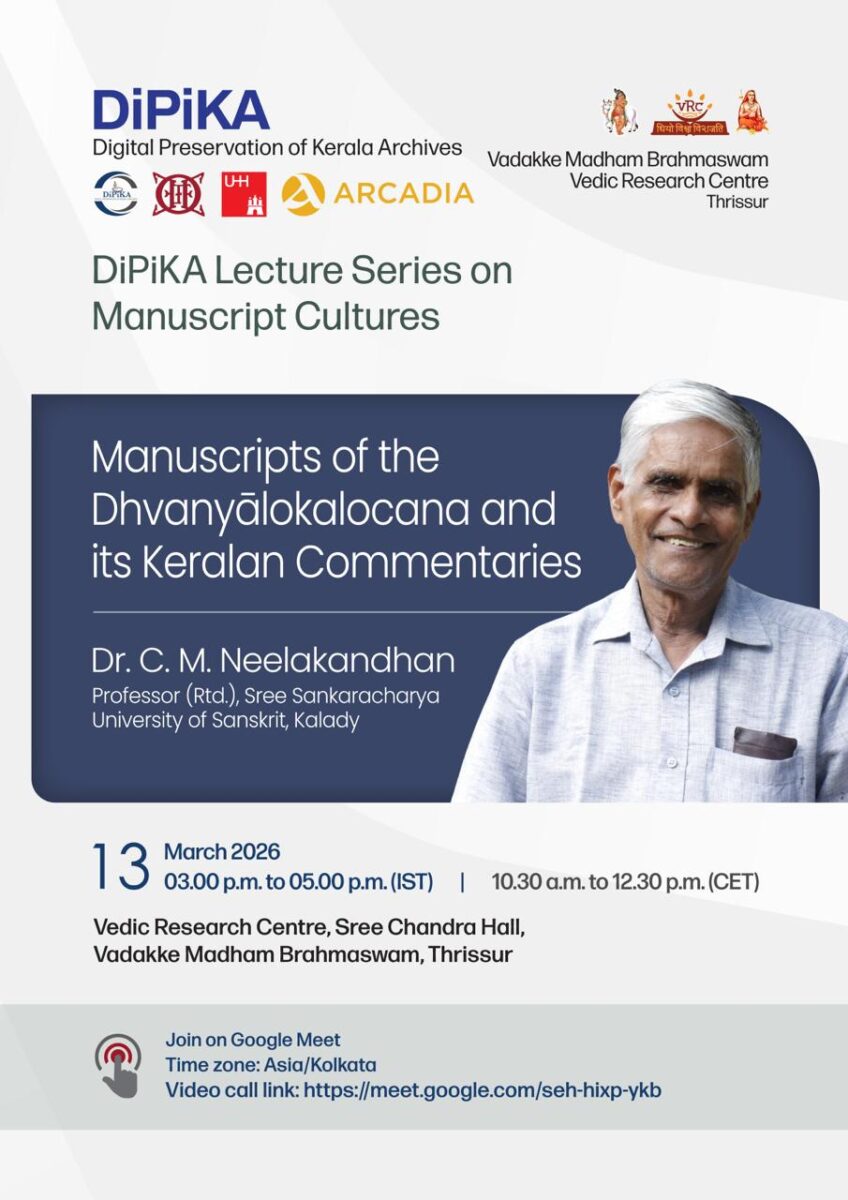 Dans le cadre des DiPiKA Lectures in Manuscript Cultures, C.M. Neelakandhan (professeur de sanskrit émérite à l’université Sree Sankaracharya de Kalady) présente une conférence intitulée « Manuscripts of the Dhvanyālokalocana and its Keralan Commentaries ».