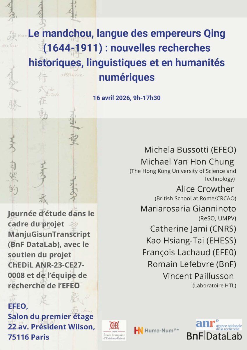 La journée d’étude « Le mandchou, langue des empereurs Qing (1644-1911) : nouvelles recherches historiques, linguistiques et en humanités numériques » est organisée dans le cadre du projet ManjuGisunTranscript (BnF DataLab), avec le soutien du projet ChEDiL ANR-23-CE27-0008 et de l’équipe de recherche de l’EFEO.