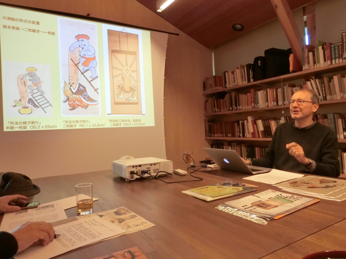 Dans le cadre de ce programme, Christophe Marquet travaille en particulier sur l’imagerie populaire d’Ōtsu, ville relais à proximité de Kyōto, entre le XVIIe et le XIXe siècle. Cette recherche comporte des enquêtes dans les collections publiques et privées et les archives de ventes ; l’élaboration d’une base de données du corpus ; des analyses non invasives de pigments et de papiers ; l’établissement d’une typo-chronologie ; l’étude des thèmes picturaux ; l’analyse de l’influence de l’imagerie d’Ōtsu sur les genres artistiques, littéraires et théâtraux. L’objectif de cette recherche est de retracer l’évolution de cet art populaire et des croyances qui lui étaient associées.