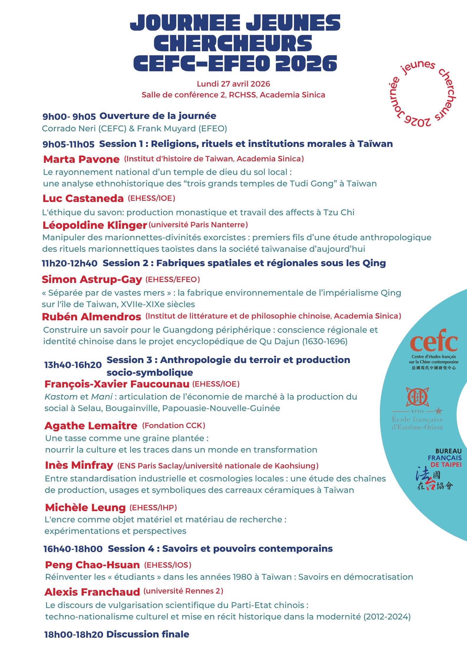 On April 2, Pierre Boccanfuso (CNRS, CASE), "Adapter son terrain à l’anthropologie visuelle. Une expérience d’immersion totale, depuis 1994, autour de la projection du film Les deux fils du chaman" On April 16, Dana Rappoport (CNRS, CASE), "Déboires et aventures ethnomusicologiques : trois terrains en Indonésie et au Timor" - EHESS seminar in the framework of the Master's degree in Asian Studies, Anthropologie comparée de l'Asie du Sud-Est. Marges et pouvoirs locaux : ethnographies et histoire régionale